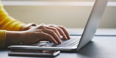 Women with a yellow jumper typing on a laptop